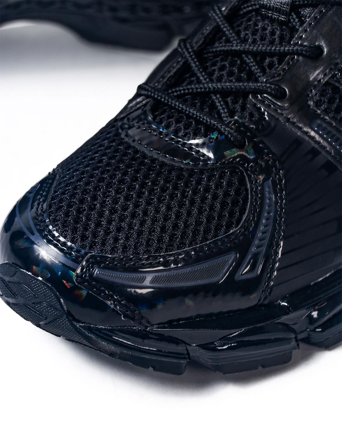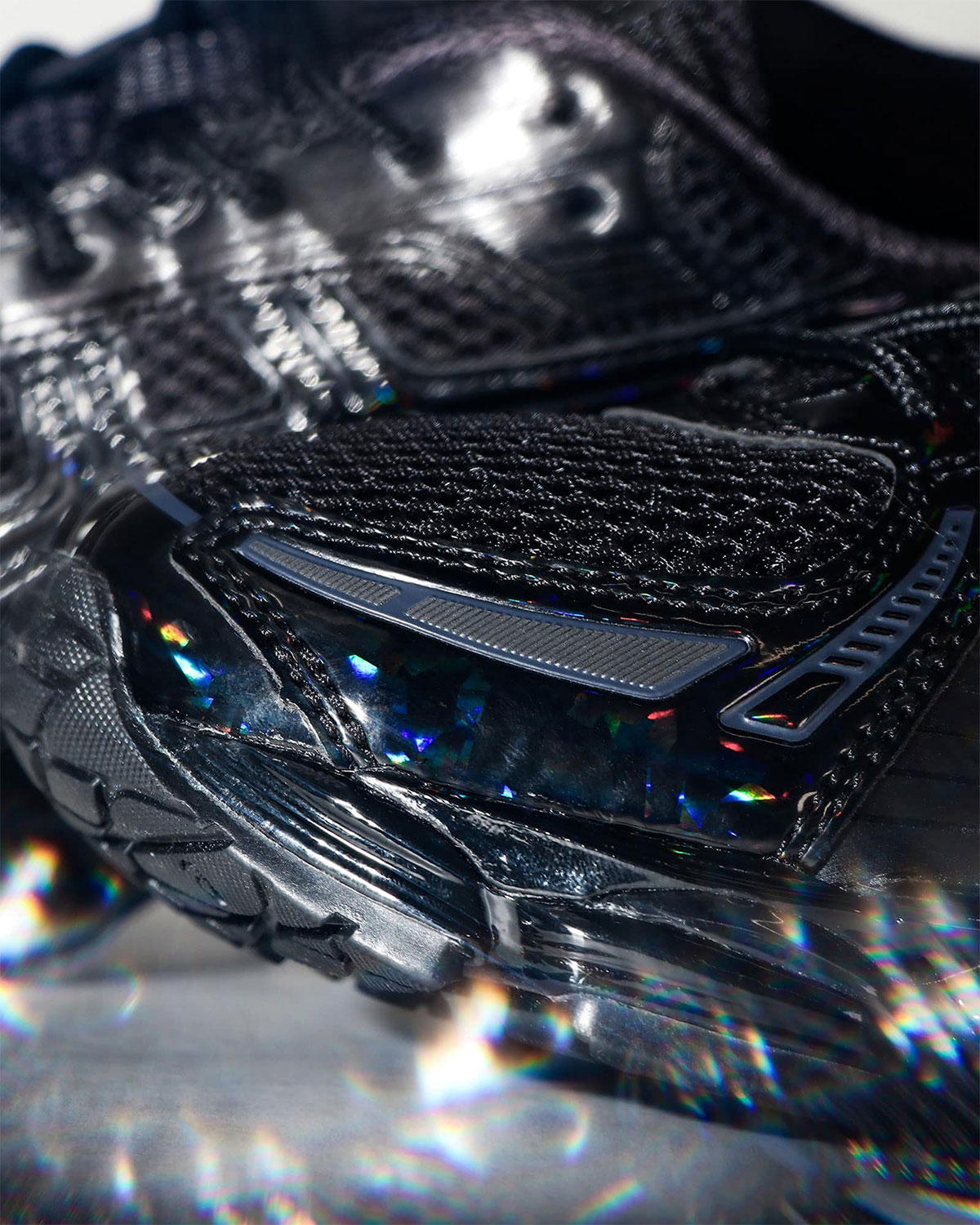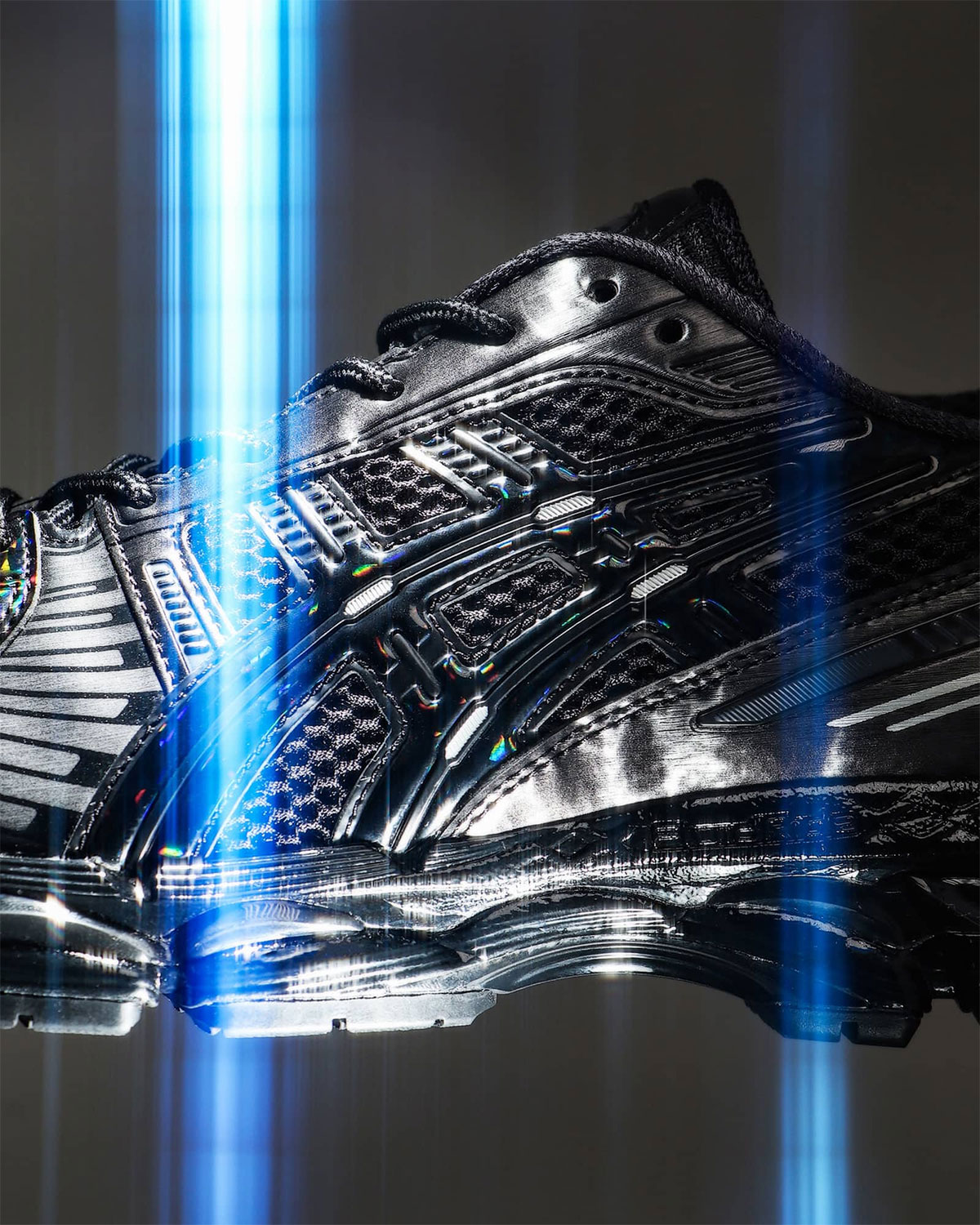 Важливо, що цей декоративний шар не виглядає надмірним. Основу силуету складає чорна сітка, яка додає конструкції технічної строгості та врівноважує блискучі елементи. Глянцевий шар над амортизацією GEL у підошві продовжує концепцію лакованої поверхні, створюючи цілісний образ, де традиція та інновація не конфліктують, а доповнюють одна одну.
